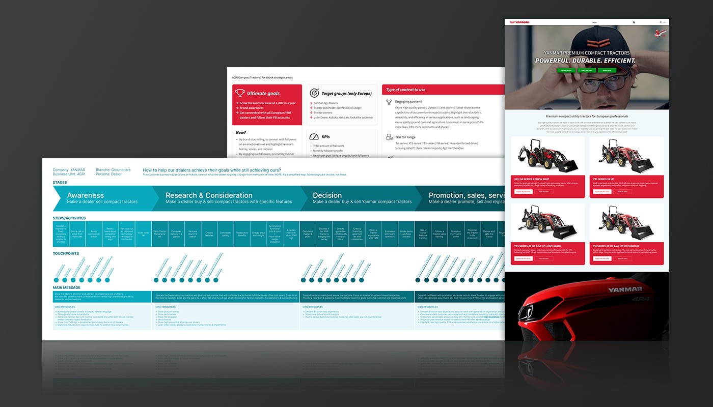 Yanmar Agricultural en haar dealers liepen tegen meerdere obstakels aan. De website was niet geoptimaliseerd voor gebruiksvriendelijkheid en SEO, waardoor potentiële klanten moeilijk de juiste informatie konden vinden. Veel dealers hadden geen ervaring met online marketing, wisten niet hoe ze digitale advertenties effectief konden inzetten en misten de kennis om een brug te slaan tussen het Yanmar compact tractor aanbod en de specifieke behoeften van hun doelgroep. Bovendien had Yanmar zelf beperkte tijd en middelen om dealers digitaal te ondersteunen, wat de effectiviteit van hun gezamenlijke marketinginspanningen beperkte.